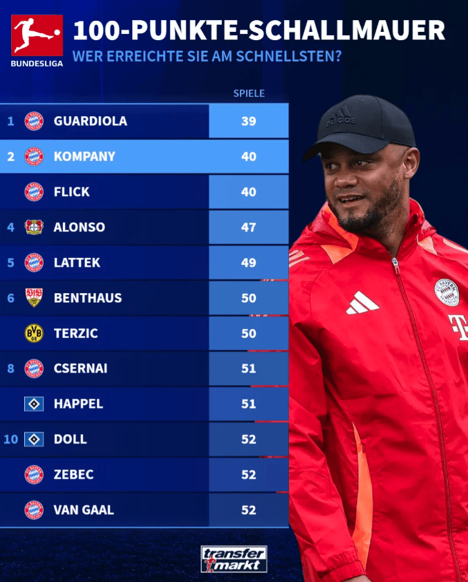 从数据上看,瓜迪奥拉的统治级表现依旧无人能敌。他仅用39场便拿到100分的惊人效率,展现了当年拜仁在他的战术体系下所达到的恐怖稳定性。而孔帕尼则成为继弗里克之后,最快带队达到百积分的拜仁主帅之一,预示着他有望在未来延续拜仁的辉煌传统。